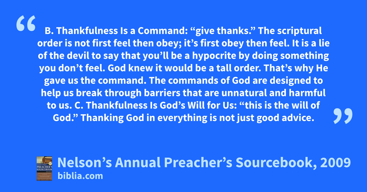 B. Thankfulness Is a Command: “give thanks.” The scriptural order is not first feel then obey; it’s first obey then feel. It is a lie of the devil to say that you’ll be a hypocrite by doing something you don’t feel. God knew it would be a tall order. That’s why He gave us the command. The commands of God are designed to help us break through barriers that are unnatural and harmful to us. C. Thankfulness Is God’s Will for Us: “this is the will of God.” Thanking God in everything is not just good advice.