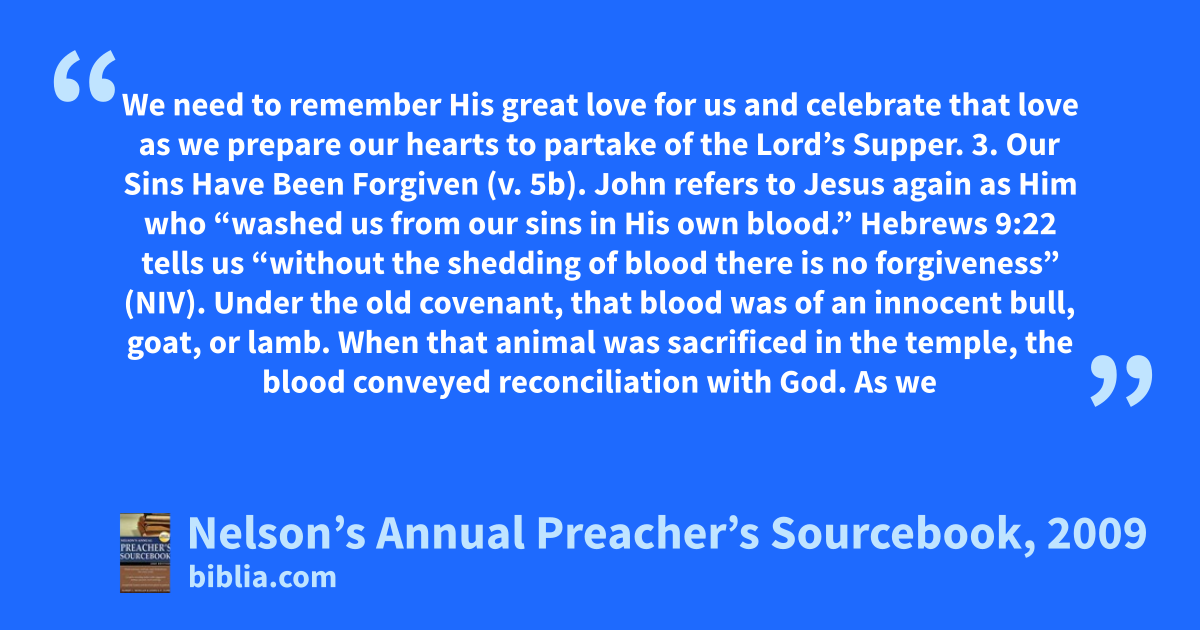 We need to remember His great love for us and celebrate that love as we prepare our hearts to partake of the Lord’s Supper. 3. Our Sins Have Been Forgiven (v. 5b). John refers to Jesus again as Him who “washed us from our sins in His own blood.” Hebrews 9:22 tells us “without the shedding of blood there is no forgiveness” (NIV). Under the old covenant, that blood was of an innocent bull, goat, or lamb. When that animal was sacrificed in the temple, the blood conveyed reconciliation with God. As we