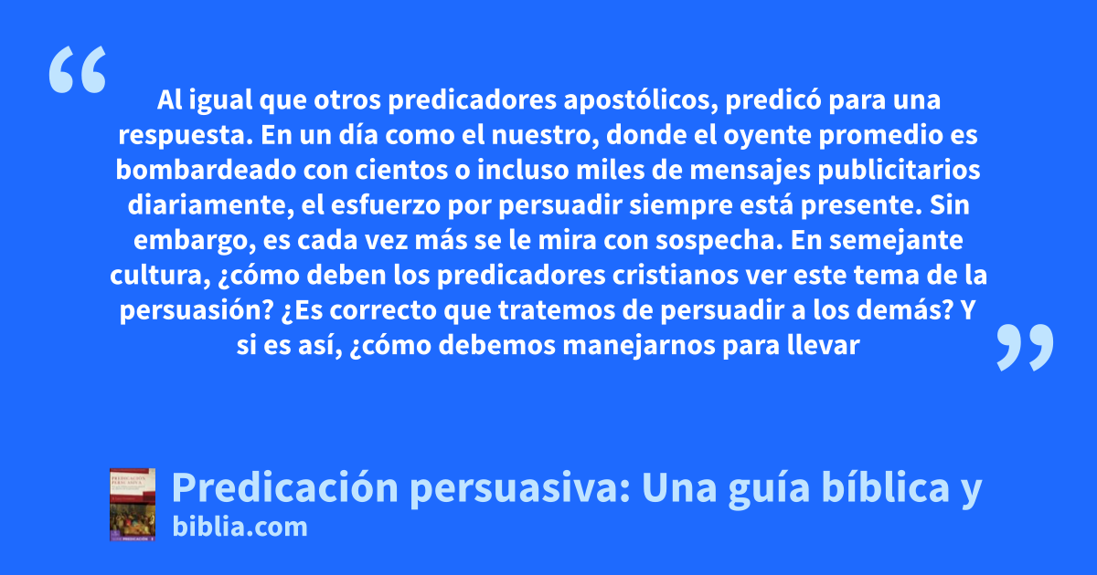 Al igual que otros predicadores apostólicos, predicó para una respuesta. En un día como el nuestro, donde el oyente promedio es bombardeado con cientos o incluso miles de mensajes publicitarios diariamente, el esfuerzo por persuadir siempre está presente. Sin embargo, es cada vez más se le mira con sospecha. En semejante cultura, ¿cómo deben los predicadores cristianos ver este tema de la persuasión? ¿Es correcto que tratemos de persuadir a los demás? Y si es así, ¿cómo debemos manejarnos para llevar
