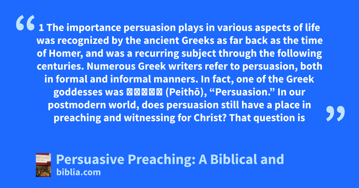1 The importance persuasion plays in various aspects of life was recognized by the ancient Greeks as far back as the time of Homer, and was a recurring subject through the following centuries. Numerous Greek writers refer to persuasion, both in formal and informal manners. In fact, one of the Greek goddesses was Πειθώ (Peithō), “Persuasion.” In our postmodern world, does persuasion still have a place in preaching and witnessing for Christ? That question is