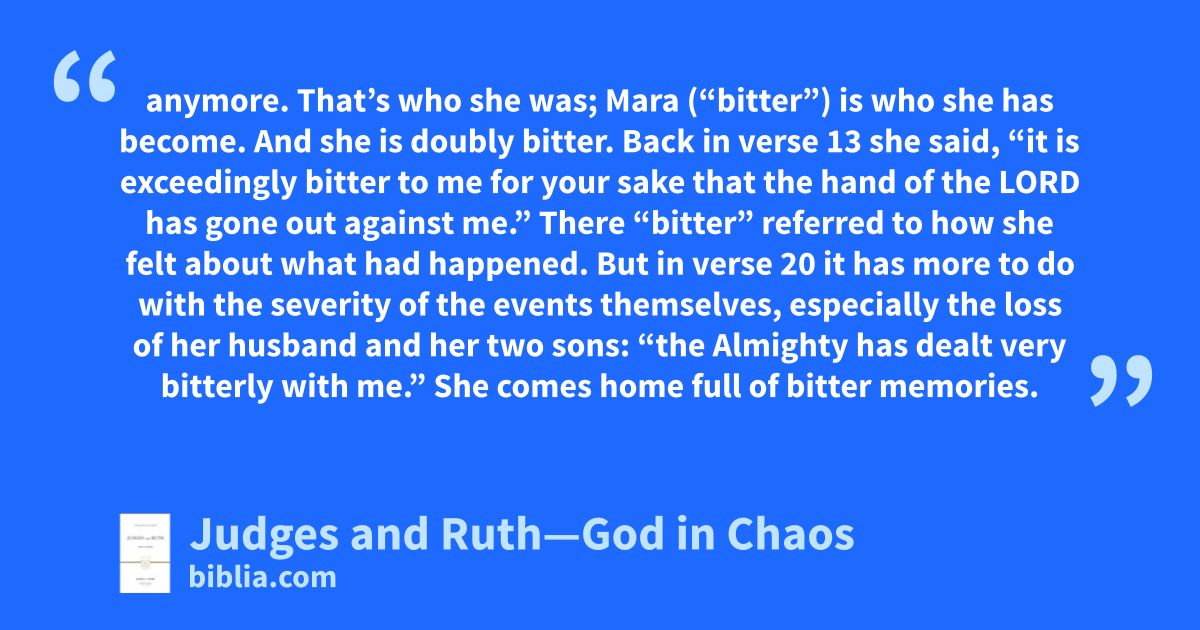 anymore. That’s who she was; Mara (“bitter”) is who she has become. And she is doubly bitter. Back in verse 13 she said, “it is exceedingly bitter to me for your sake that the hand of the LORD has gone out against me.” There “bitter” referred to how she felt about what had happened. But in verse 20 it has more to do with the severity of the events themselves, especially the loss of her husband and her two sons: “the Almighty has dealt very bitterly with me.” She comes home full of bitter memories.