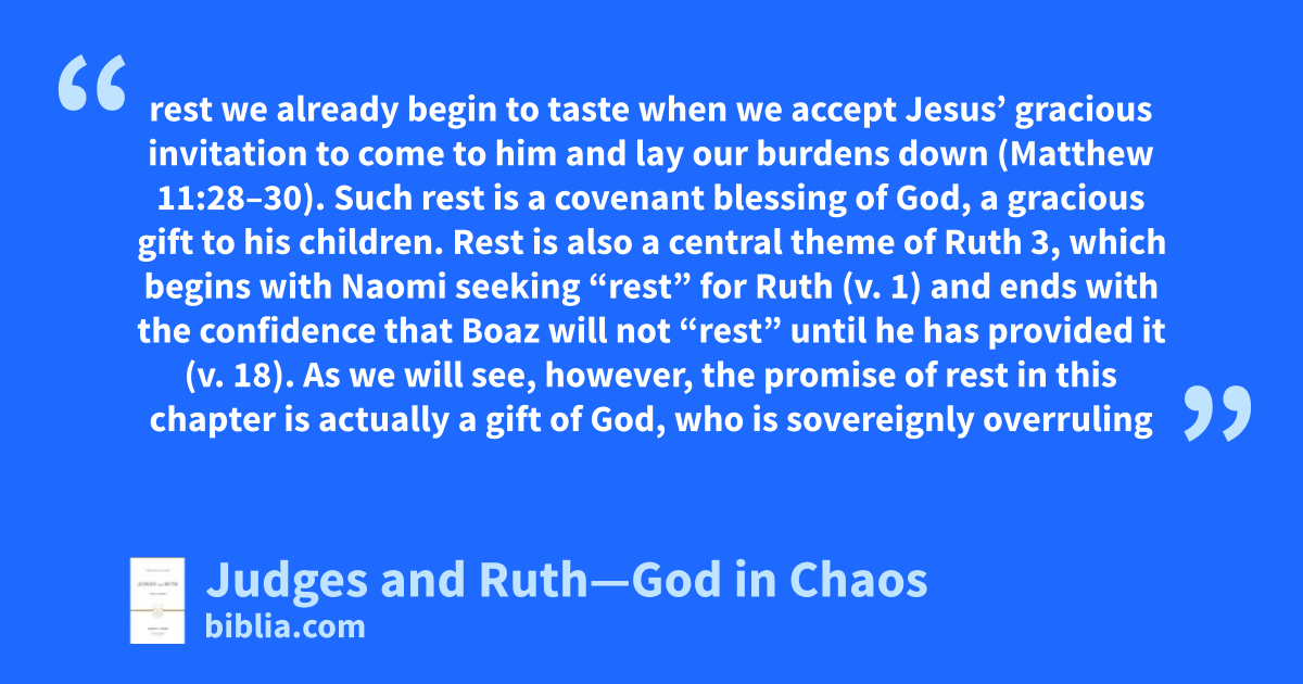 rest we already begin to taste when we accept Jesus’ gracious invitation to come to him and lay our burdens down (Matthew 11:28–30). Such rest is a covenant blessing of God, a gracious gift to his children. Rest is also a central theme of Ruth 3, which begins with Naomi seeking “rest” for Ruth (v. 1) and ends with the confidence that Boaz will not “rest” until he has provided it (v. 18). As we will see, however, the promise of rest in this chapter is actually a gift of God, who is sovereignly overruling