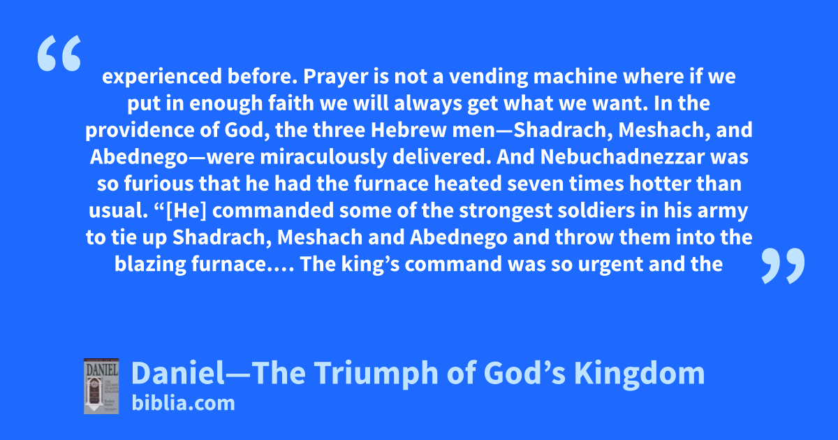 experienced before. Prayer is not a vending machine where if we put in enough faith we will always get what we want. In the providence of God, the three Hebrew men—Shadrach, Meshach, and Abednego—were miraculously delivered. And Nebuchadnezzar was so furious that he had the furnace heated seven times hotter than usual. “[He] commanded some of the strongest soldiers in his army to tie up Shadrach, Meshach and Abednego and throw them into the blazing furnace.… The king’s command was so urgent and the