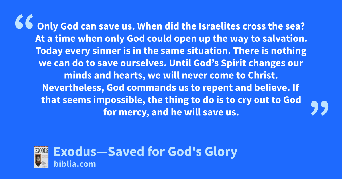 Only God can save us. When did the Israelites cross the sea? At a time when only God could open up the way to salvation. Today every sinner is in the same situation. There is nothing we can do to save ourselves. Until God’s Spirit changes our minds and hearts, we will never come to Christ. Nevertheless, God commands us to repent and believe. If that seems impossible, the thing to do is to cry out to God for mercy, and he will save us.