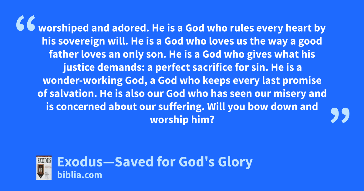 worshiped and adored. He is a God who rules every heart by his sovereign will. He is a God who loves us the way a good father loves an only son. He is a God who gives what his justice demands: a perfect sacrifice for sin. He is a wonder-working God, a God who keeps every last promise of salvation. He is also our God who has seen our misery and is concerned about our suffering. Will you bow down and worship him?