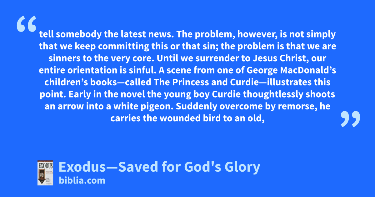 tell somebody the latest news. The problem, however, is not simply that we keep committing this or that sin; the problem is that we are sinners to the very core. Until we surrender to Jesus Christ, our entire orientation is sinful. A scene from one of George MacDonald’s children’s books—called The Princess and Curdie—illustrates this point. Early in the novel the young boy Curdie thoughtlessly shoots an arrow into a white pigeon. Suddenly overcome by remorse, he carries the wounded bird to an old,