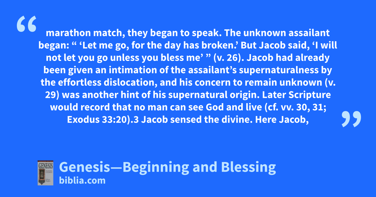 marathon match, they began to speak. The unknown assailant began: “ ‘Let me go, for the day has broken.’ But Jacob said, ‘I will not let you go unless you bless me’ ” (v. 26). Jacob had already been given an intimation of the assailant’s supernaturalness by the effortless dislocation, and his concern to remain unknown (v. 29) was another hint of his supernatural origin. Later Scripture would record that no man can see God and live (cf. vv. 30, 31; Exodus 33:20).3 Jacob sensed the divine. Here Jacob,