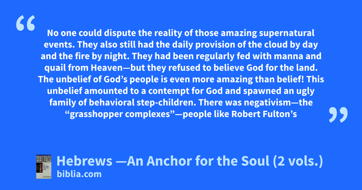 No one could dispute the reality of those amazing supernatural events. They also still had the daily provision of the cloud by day and the fire by night. They had been regularly fed with manna and quail from Heaven—but they refused to believe God for the land. The unbelief of God’s people is even more amazing than belief! This unbelief amounted to a contempt for God and spawned an ugly family of behavioral step-children. There was negativism—the “grasshopper complexes”—people like Robert Fulton’s