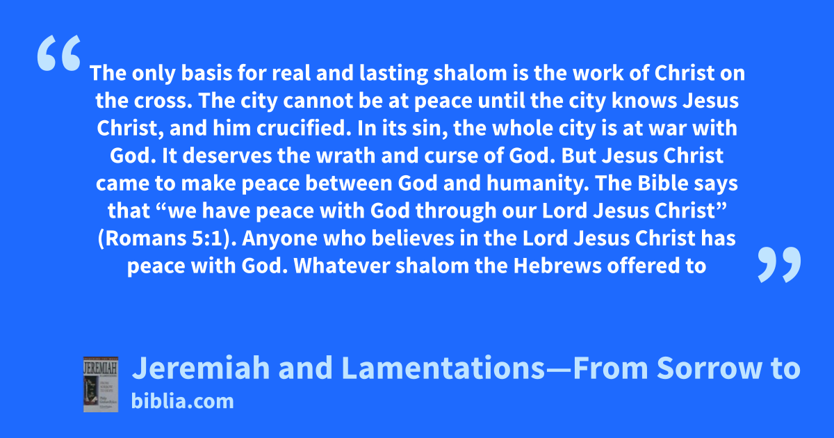 The only basis for real and lasting shalom is the work of Christ on the cross. The city cannot be at peace until the city knows Jesus Christ, and him crucified. In its sin, the whole city is at war with God. It deserves the wrath and curse of God. But Jesus Christ came to make peace between God and humanity. The Bible says that “we have peace with God through our Lord Jesus Christ” (Romans 5:1). Anyone who believes in the Lord Jesus Christ has peace with God. Whatever shalom the Hebrews offered to