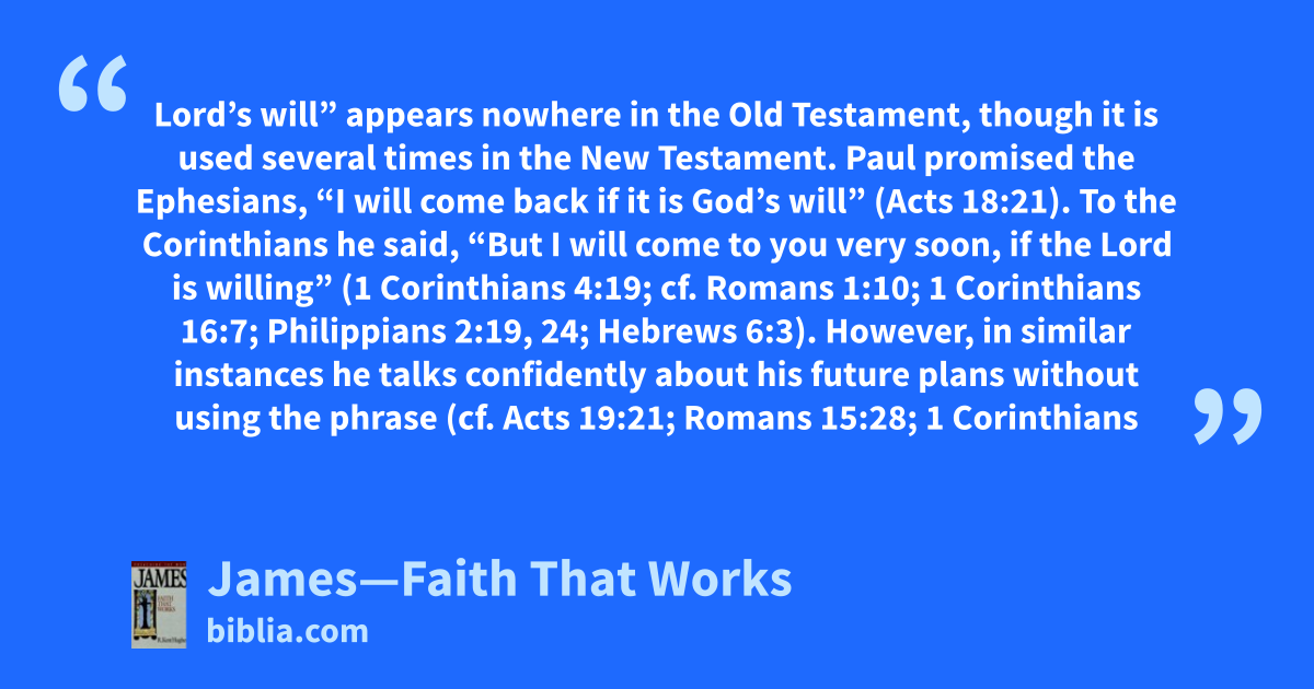 Lord’s will” appears nowhere in the Old Testament, though it is used several times in the New Testament. Paul promised the Ephesians, “I will come back if it is God’s will” (Acts 18:21). To the Corinthians he said, “But I will come to you very soon, if the Lord is willing” (1 Corinthians 4:19; cf. Romans 1:10; 1 Corinthians 16:7; Philippians 2:19, 24; Hebrews 6:3). However, in similar instances he talks confidently about his future plans without using the phrase (cf. Acts 19:21; Romans 15:28; 1 Corinthians