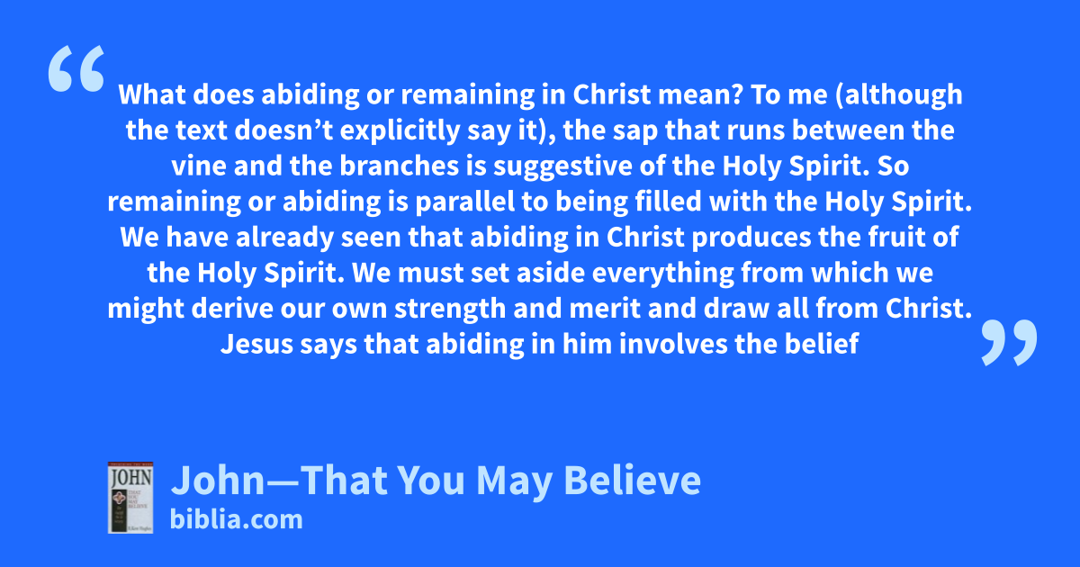 What does abiding or remaining in Christ mean? To me (although the text doesn’t explicitly say it), the sap that runs between the vine and the branches is suggestive of the Holy Spirit. So remaining or abiding is parallel to being filled with the Holy Spirit. We have already seen that abiding in Christ produces the fruit of the Holy Spirit. We must set aside everything from which we might derive our own strength and merit and draw all from Christ. Jesus says that abiding in him involves the belief