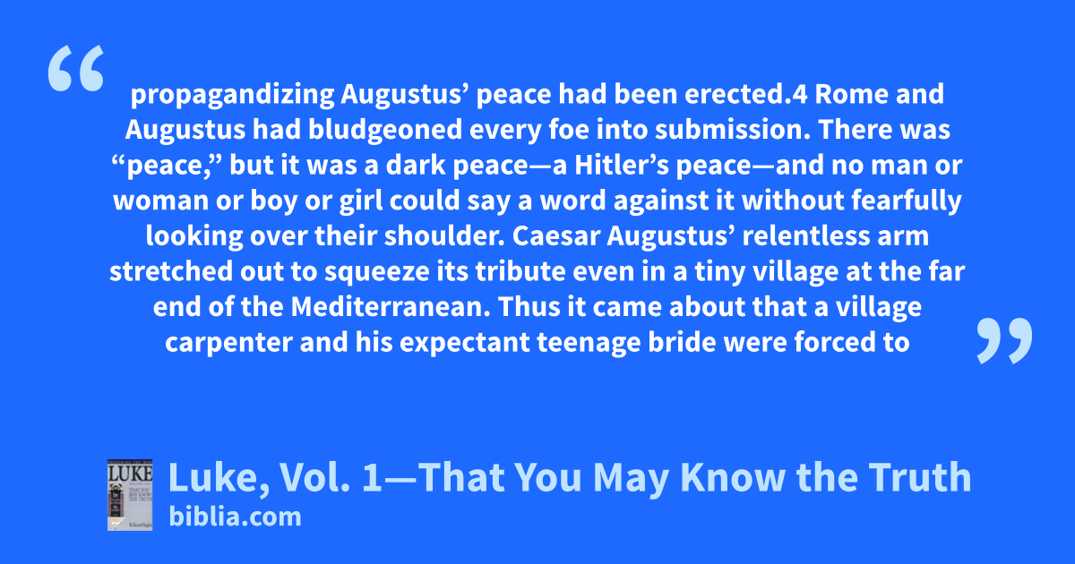 propagandizing Augustus’ peace had been erected.4 Rome and Augustus had bludgeoned every foe into submission. There was “peace,” but it was a dark peace—a Hitler’s peace—and no man or woman or boy or girl could say a word against it without fearfully looking over their shoulder. Caesar Augustus’ relentless arm stretched out to squeeze its tribute even in a tiny village at the far end of the Mediterranean. Thus it came about that a village carpenter and his expectant teenage bride were forced to