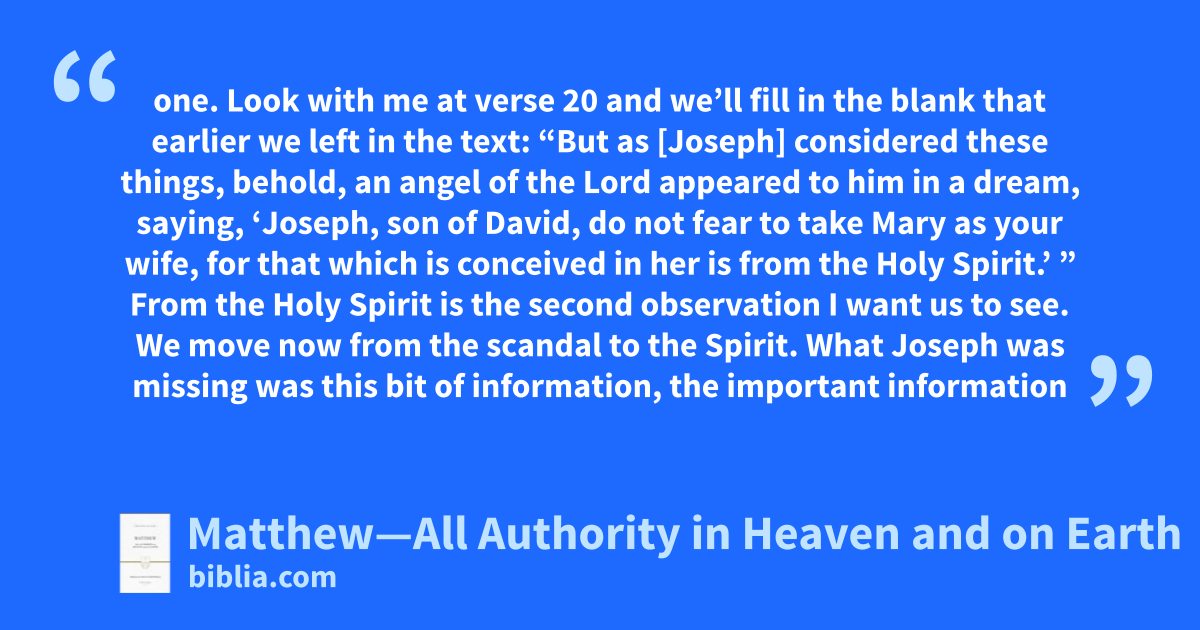 one. Look with me at verse 20 and we’ll fill in the blank that earlier we left in the text: “But as [Joseph] considered these things, behold, an angel of the Lord appeared to him in a dream, saying, ‘Joseph, son of David, do not fear to take Mary as your wife, for that which is conceived in her is from the Holy Spirit.’ ” From the Holy Spirit is the second observation I want us to see. We move now from the scandal to the Spirit. What Joseph was missing was this bit of information, the important information