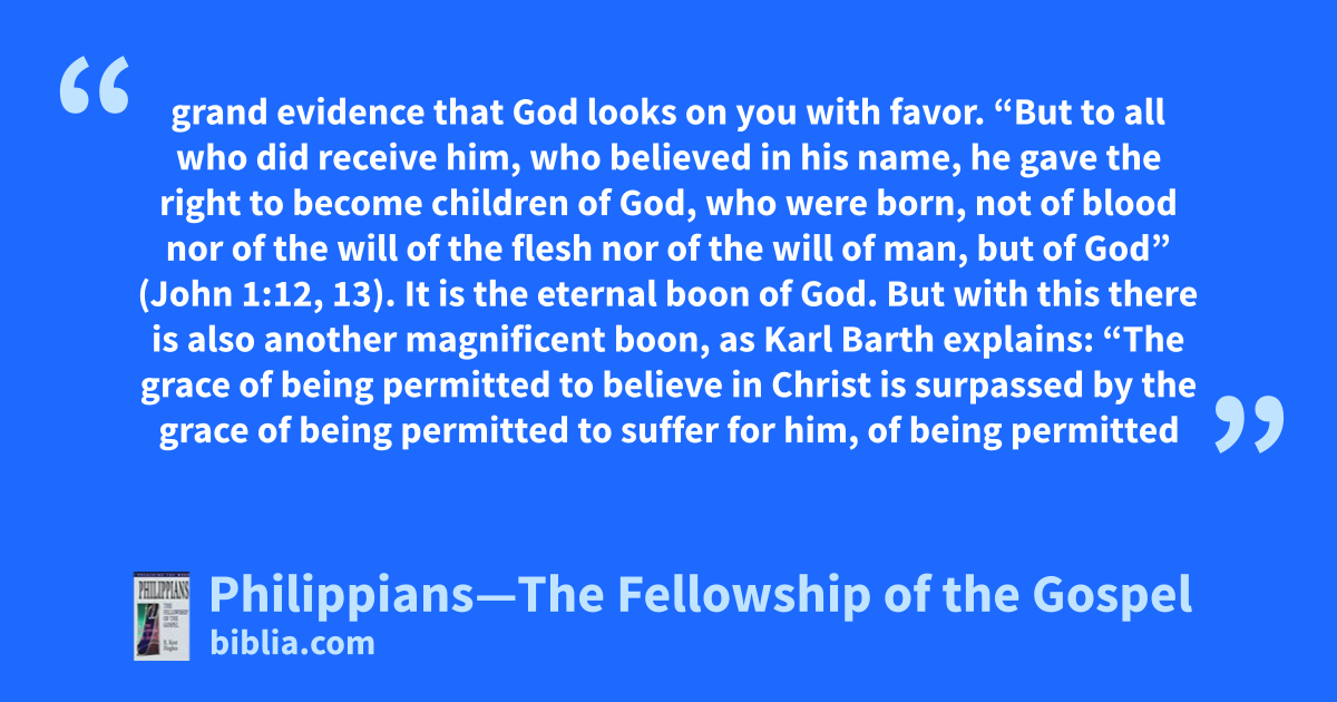 grand evidence that God looks on you with favor. “But to all who did receive him, who believed in his name, he gave the right to become children of God, who were born, not of blood nor of the will of the flesh nor of the will of man, but of God” (John 1:12, 13). It is the eternal boon of God. But with this there is also another magnificent boon, as Karl Barth explains: “The grace of being permitted to believe in Christ is surpassed by the grace of being permitted to suffer for him, of being permitted