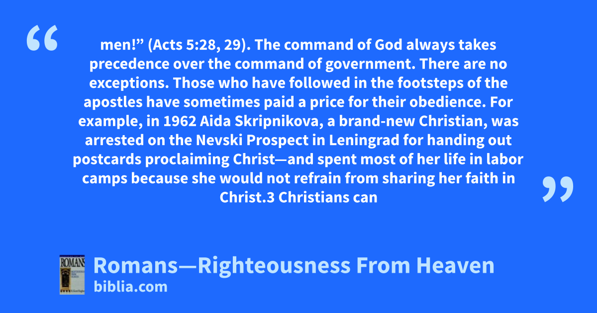 men!” (Acts 5:28, 29). The command of God always takes precedence over the command of government. There are no exceptions. Those who have followed in the footsteps of the apostles have sometimes paid a price for their obedience. For example, in 1962 Aida Skripnikova, a brand-new Christian, was arrested on the Nevski Prospect in Leningrad for handing out postcards proclaiming Christ—and spent most of her life in labor camps because she would not refrain from sharing her faith in Christ.3 Christians can