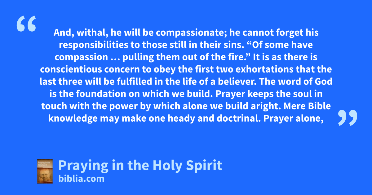And, withal, he will be compassionate; he cannot forget his responsibilities to those still in their sins. “Of some have compassion … pulling them out of the fire.” It is as there is conscientious concern to obey the first two exhortations that the last three will be fulfilled in the life of a believer. The word of God is the foundation on which we build. Prayer keeps the soul in touch with the power by which alone we build aright. Mere Bible knowledge may make one heady and doctrinal. Prayer alone,