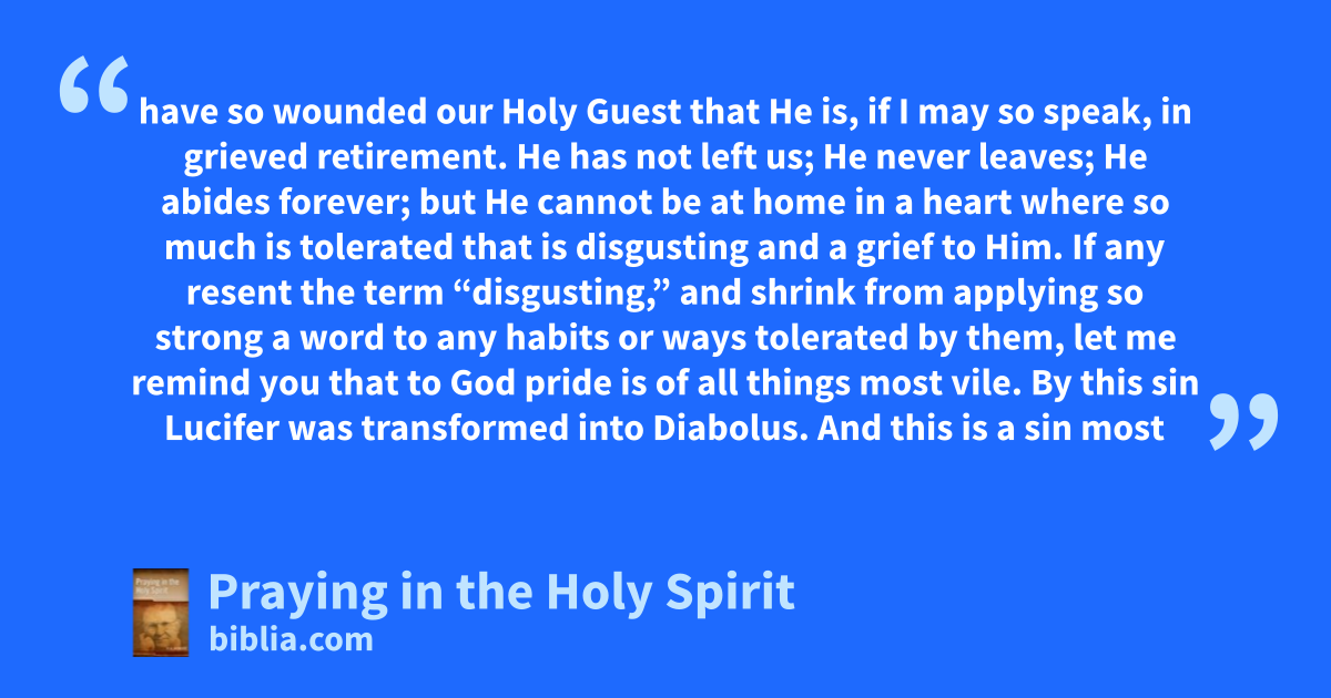 have so wounded our Holy Guest that He is, if I may so speak, in grieved retirement. He has not left us; He never leaves; He abides forever; but He cannot be at home in a heart where so much is tolerated that is disgusting and a grief to Him. If any resent the term “disgusting,” and shrink from applying so strong a word to any habits or ways tolerated by them, let me remind you that to God pride is of all things most vile. By this sin Lucifer was transformed into Diabolus. And this is a sin most