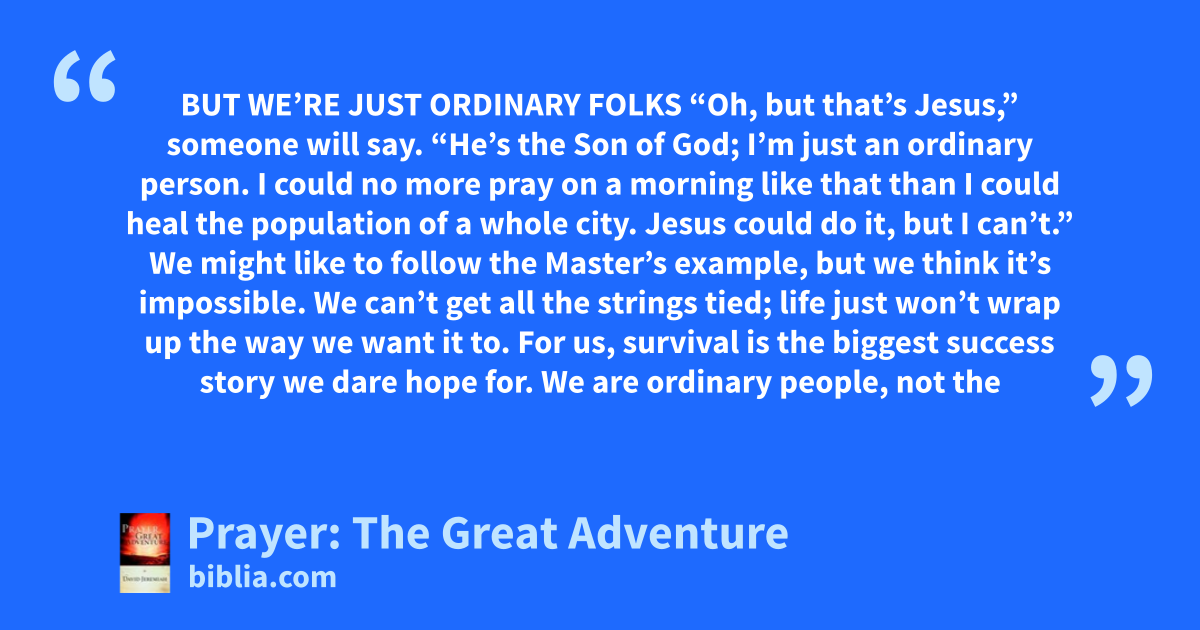 BUT WE’RE JUST ORDINARY FOLKS “Oh, but that’s Jesus,” someone will say. “He’s the Son of God; I’m just an ordinary person. I could no more pray on a morning like that than I could heal the population of a whole city. Jesus could do it, but I can’t.” We might like to follow the Master’s example, but we think it’s impossible. We can’t get all the strings tied; life just won’t wrap up the way we want it to. For us, survival is the biggest success story we dare hope for. We are ordinary people, not the