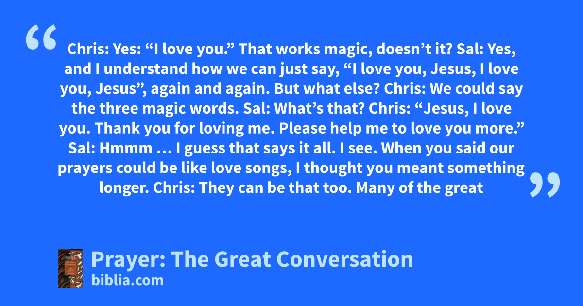 Chris: Yes: “I love you.” That works magic, doesn’t it? Sal: Yes, and I understand how we can just say, “I love you, Jesus, I love you, Jesus”, again and again. But what else? Chris: We could say the three magic words. Sal: What’s that? Chris: “Jesus, I love you. Thank you for loving me. Please help me to love you more.” Sal: Hmmm … I guess that says it all. I see. When you said our prayers could be like love songs, I thought you meant something longer. Chris: They can be that too. Many of the great