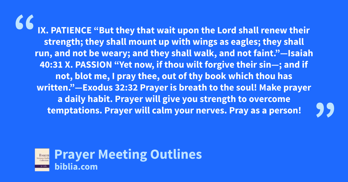 IX. PATIENCE “But they that wait upon the Lord shall renew their strength; they shall mount up with wings as eagles; they shall run, and not be weary; and they shall walk, and not faint.”—Isaiah 40:31 X. PASSION “Yet now, if thou wilt forgive their sin—; and if not, blot me, I pray thee, out of thy book which thou has written.”—Exodus 32:32 Prayer is breath to the soul! Make prayer a daily habit. Prayer will give you strength to overcome temptations. Prayer will calm your nerves. Pray as a person!