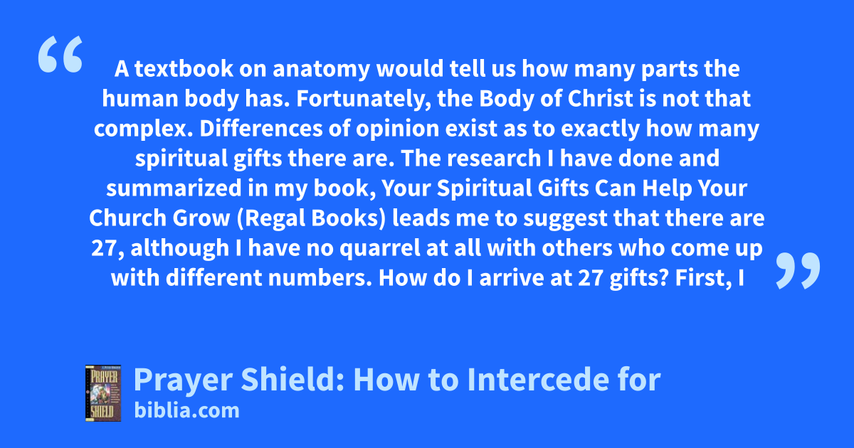 A textbook on anatomy would tell us how many parts the human body has. Fortunately, the Body of Christ is not that complex. Differences of opinion exist as to exactly how many spiritual gifts there are. The research I have done and summarized in my book, Your Spiritual Gifts Can Help Your Church Grow (Regal Books) leads me to suggest that there are 27, although I have no quarrel at all with others who come up with different numbers. How do I arrive at 27 gifts? First, I