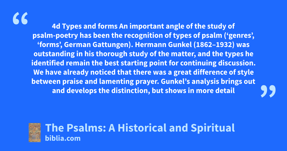 4d Types and forms An important angle of the study of psalm-poetry has been the recognition of types of psalm (‘genres’, ‘forms’, German Gattungen). Hermann Gunkel (1862–1932) was outstanding in his thorough study of the matter, and the types he identified remain the best starting point for continuing discussion. We have already noticed that there was a great difference of style between praise and lamenting prayer. Gunkel’s analysis brings out and develops the distinction, but shows in more detail