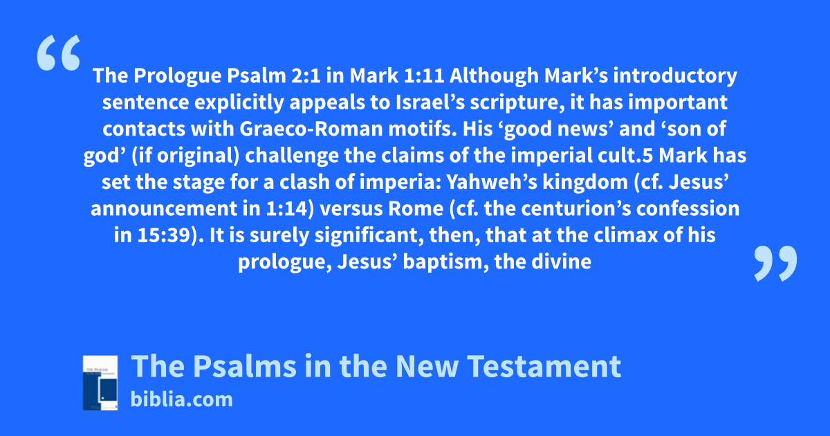 The Prologue Psalm 2:1 in Mark 1:11 Although Mark’s introductory sentence explicitly appeals to Israel’s scripture, it has important contacts with Graeco-Roman motifs. His ‘good news’ and ‘son of god’ (if original) challenge the claims of the imperial cult.5 Mark has set the stage for a clash of imperia: Yahweh’s kingdom (cf. Jesus’ announcement in 1:14) versus Rome (cf. the centurion’s confession in 15:39). It is surely significant, then, that at the climax of his prologue, Jesus’ baptism, the divine