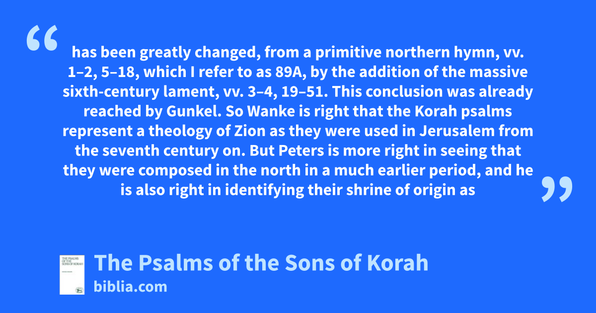 has been greatly changed, from a primitive northern hymn, vv. 1–2, 5–18, which I refer to as 89A, by the addition of the massive sixth-century lament, vv. 3–4, 19–51. This conclusion was already reached by Gunkel. So Wanke is right that the Korah psalms represent a theology of Zion as they were used in Jerusalem from the seventh century on. But Peters is more right in seeing that they were composed in the north in a much earlier period, and he is also right in identifying their shrine of origin as