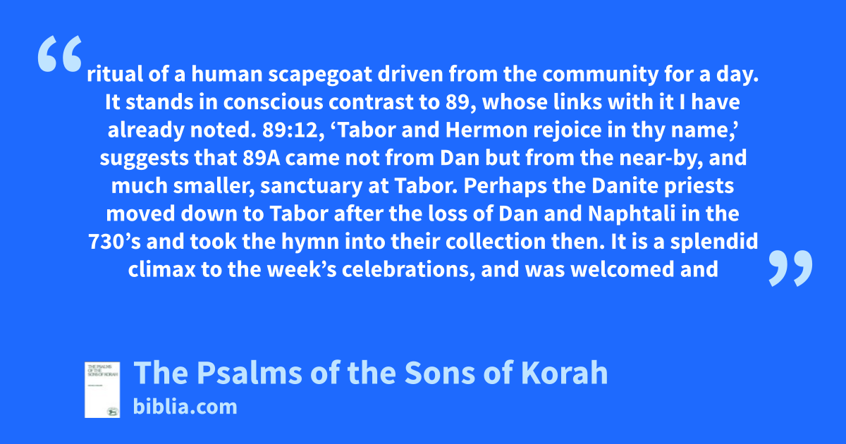 ritual of a human scapegoat driven from the community for a day. It stands in conscious contrast to 89, whose links with it I have already noted. 89:12, ‘Tabor and Hermon rejoice in thy name,’ suggests that 89A came not from Dan but from the near-by, and much smaller, sanctuary at Tabor. Perhaps the Danite priests moved down to Tabor after the loss of Dan and Naphtali in the 730’s and took the hymn into their collection then. It is a splendid climax to the week’s celebrations, and was welcomed and