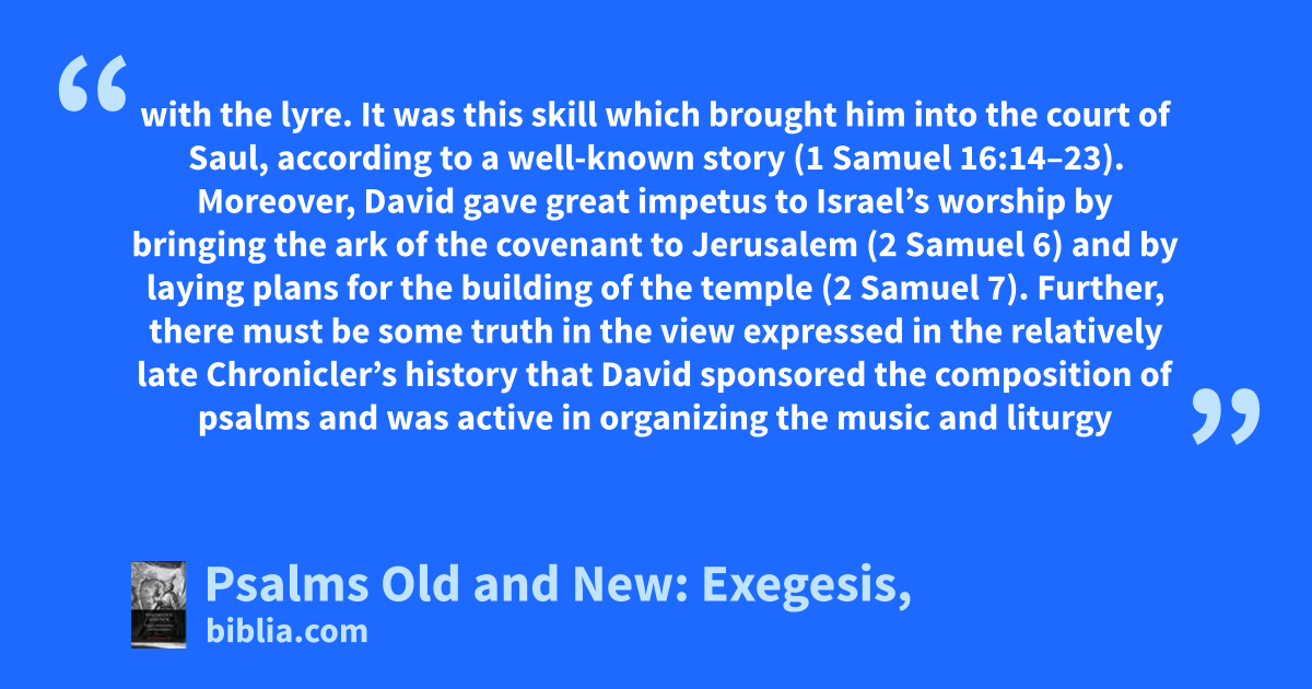 with the lyre. It was this skill which brought him into the court of Saul, according to a well-known story (1 Samuel 16:14–23). Moreover, David gave great impetus to Israel’s worship by bringing the ark of the covenant to Jerusalem (2 Samuel 6) and by laying plans for the building of the temple (2 Samuel 7). Further, there must be some truth in the view expressed in the relatively late Chronicler’s history that David sponsored the composition of psalms and was active in organizing the music and liturgy