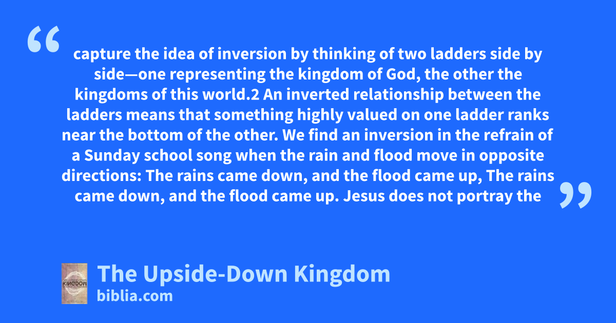 capture the idea of inversion by thinking of two ladders side by side—one representing the kingdom of God, the other the kingdoms of this world.2 An inverted relationship between the ladders means that something highly valued on one ladder ranks near the bottom of the other. We find an inversion in the refrain of a Sunday school song when the rain and flood move in opposite directions: The rains came down, and the flood came up, The rains came down, and the flood came up. Jesus does not portray the