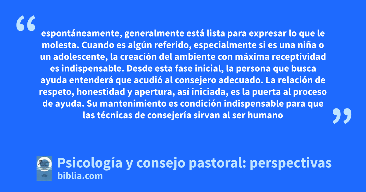 espontáneamente, generalmente está lista para expresar lo que le molesta. Cuando es algún referido, especialmente si es una niña o un adolescente, la creación del ambiente con máxima receptividad es indispensable. Desde esta fase inicial, la persona que busca ayuda entenderá que acudió al consejero adecuado. La relación de respeto, honestidad y apertura, así iniciada, es la puerta al proceso de ayuda. Su mantenimiento es condición indispensable para que las técnicas de consejería sirvan al ser humano