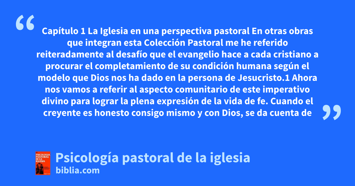 Capítulo 1 La Iglesia en una perspectiva pastoral En otras obras que integran esta Colección Pastoral me he referido reiteradamente al desafío que el evangelio hace a cada cristiano a procurar el completamiento de su condición humana según el modelo que Dios nos ha dado en la persona de Jesucristo.1 Ahora nos vamos a referir al aspecto comunitario de este imperativo divino para lograr la plena expresión de la vida de fe. Cuando el creyente es honesto consigo mismo y con Dios, se da cuenta de