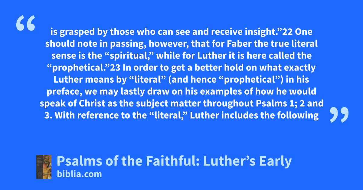 is grasped by those who can see and receive insight.”22 One should note in passing, however, that for Faber the true literal sense is the “spiritual,” while for Luther it is here called the “prophetical.”23 In order to get a better hold on what exactly Luther means by “literal” (and hence “prophetical”) in his preface, we may lastly draw on his examples of how he would speak of Christ as the subject matter throughout Psalms 1; 2 and 3. With reference to the “literal,” Luther includes the following