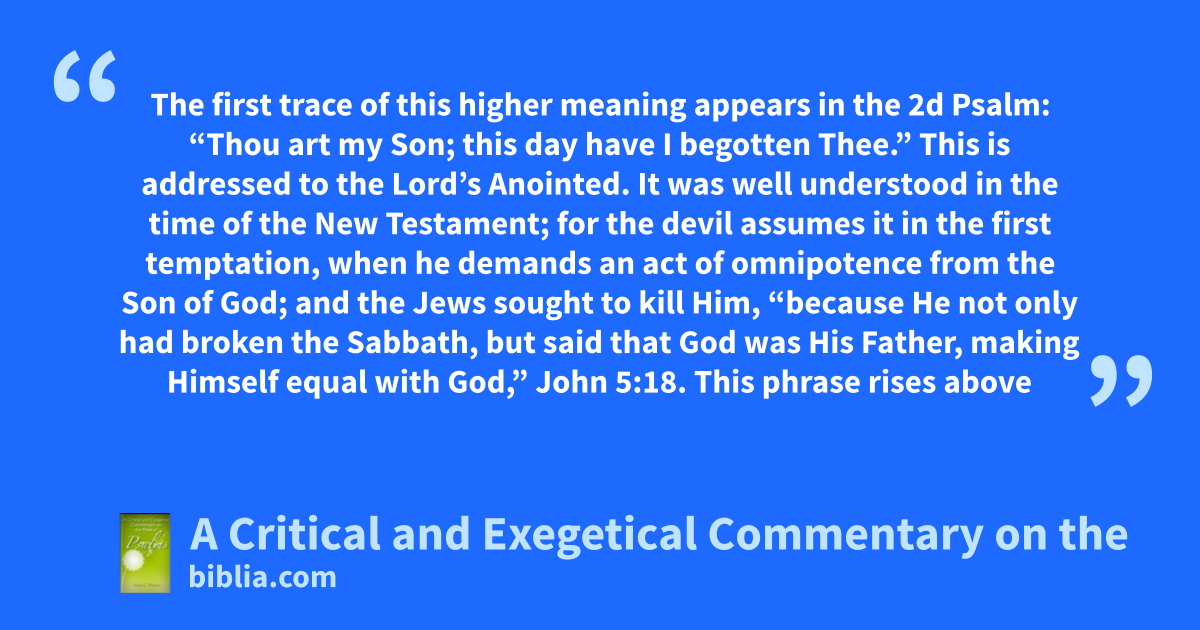 The first trace of this higher meaning appears in the 2d Psalm: “Thou art my Son; this day have I begotten Thee.” This is addressed to the Lord’s Anointed. It was well understood in the time of the New Testament; for the devil assumes it in the first temptation, when he demands an act of omnipotence from the Son of God; and the Jews sought to kill Him, “because He not only had broken the Sabbath, but said that God was His Father, making Himself equal with God,” John 5:18. This phrase rises above