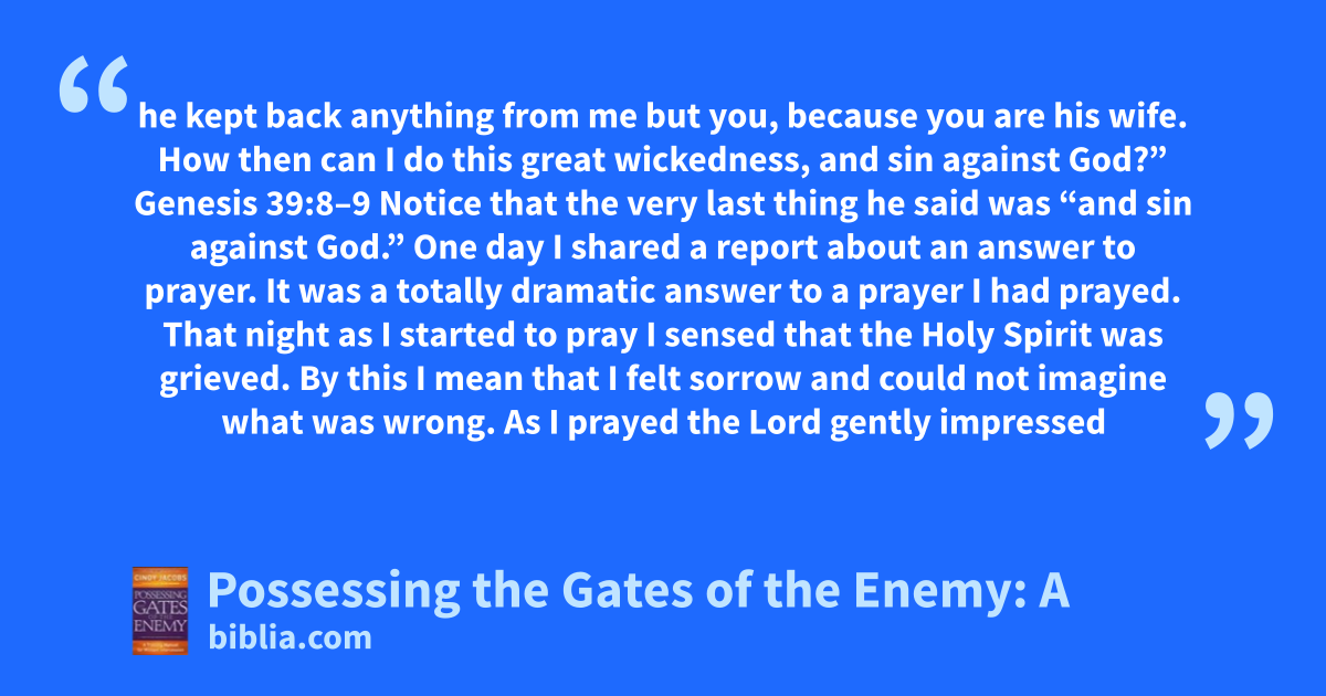 he kept back anything from me but you, because you are his wife. How then can I do this great wickedness, and sin against God?” Genesis 39:8–9 Notice that the very last thing he said was “and sin against God.” One day I shared a report about an answer to prayer. It was a totally dramatic answer to a prayer I had prayed. That night as I started to pray I sensed that the Holy Spirit was grieved. By this I mean that I felt sorrow and could not imagine what was wrong. As I prayed the Lord gently impressed