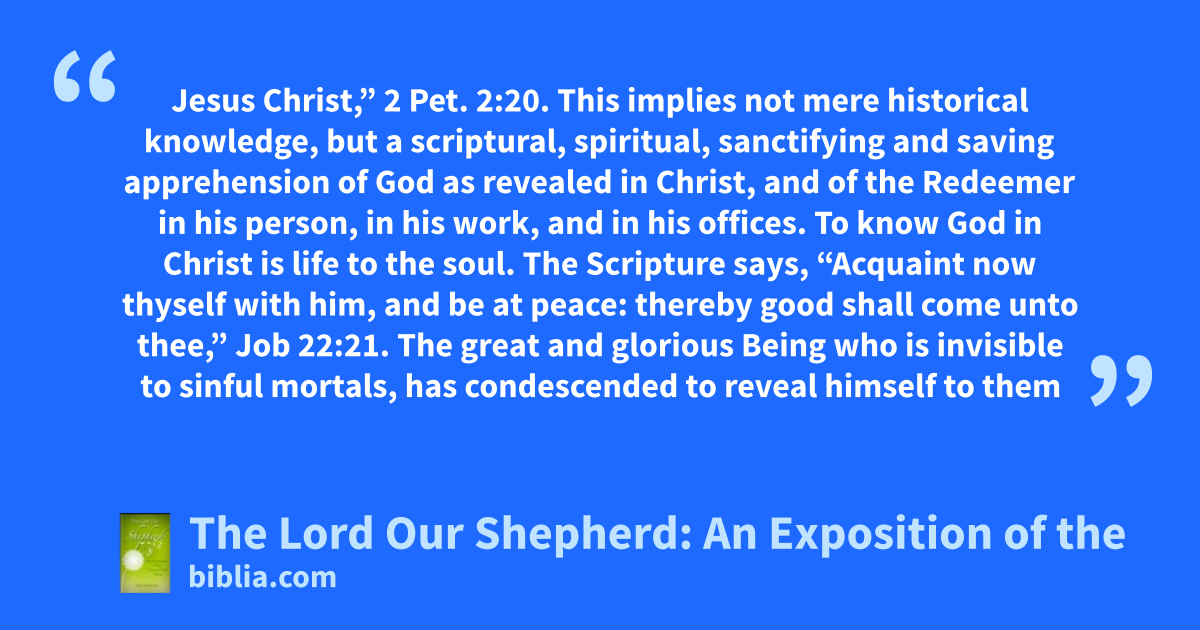 Jesus Christ,” 2 Pet. 2:20. This implies not mere historical knowledge, but a scriptural, spiritual, sanctifying and saving apprehension of God as revealed in Christ, and of the Redeemer in his person, in his work, and in his offices. To know God in Christ is life to the soul. The Scripture says, “Acquaint now thyself with him, and be at peace: thereby good shall come unto thee,” Job 22:21. The great and glorious Being who is invisible to sinful mortals, has condescended to reveal himself to them