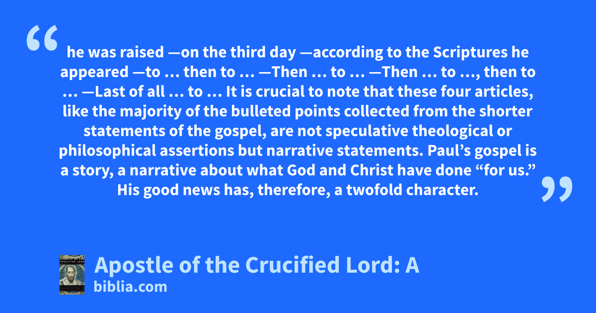 he was raised —on the third day —according to the Scriptures he appeared —to … then to … —Then … to … —Then … to …, then to … —Last of all … to … It is crucial to note that these four articles, like the majority of the bulleted points collected from the shorter statements of the gospel, are not speculative theological or philosophical assertions but narrative statements. Paul’s gospel is a story, a narrative about what God and Christ have done “for us.” His good news has, therefore, a twofold character.