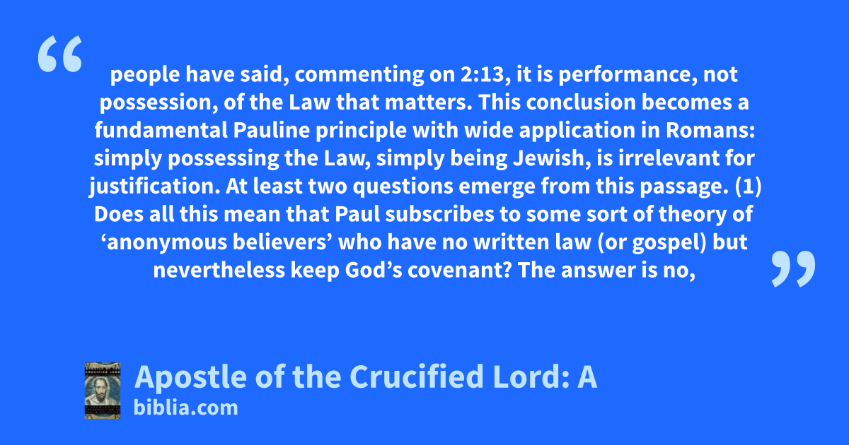 people have said, commenting on 2:13, it is performance, not possession, of the Law that matters. This conclusion becomes a fundamental Pauline principle with wide application in Romans: simply possessing the Law, simply being Jewish, is irrelevant for justification. At least two questions emerge from this passage. (1) Does all this mean that Paul subscribes to some sort of theory of ‘anonymous believers’ who have no written law (or gospel) but nevertheless keep God’s covenant? The answer is no,