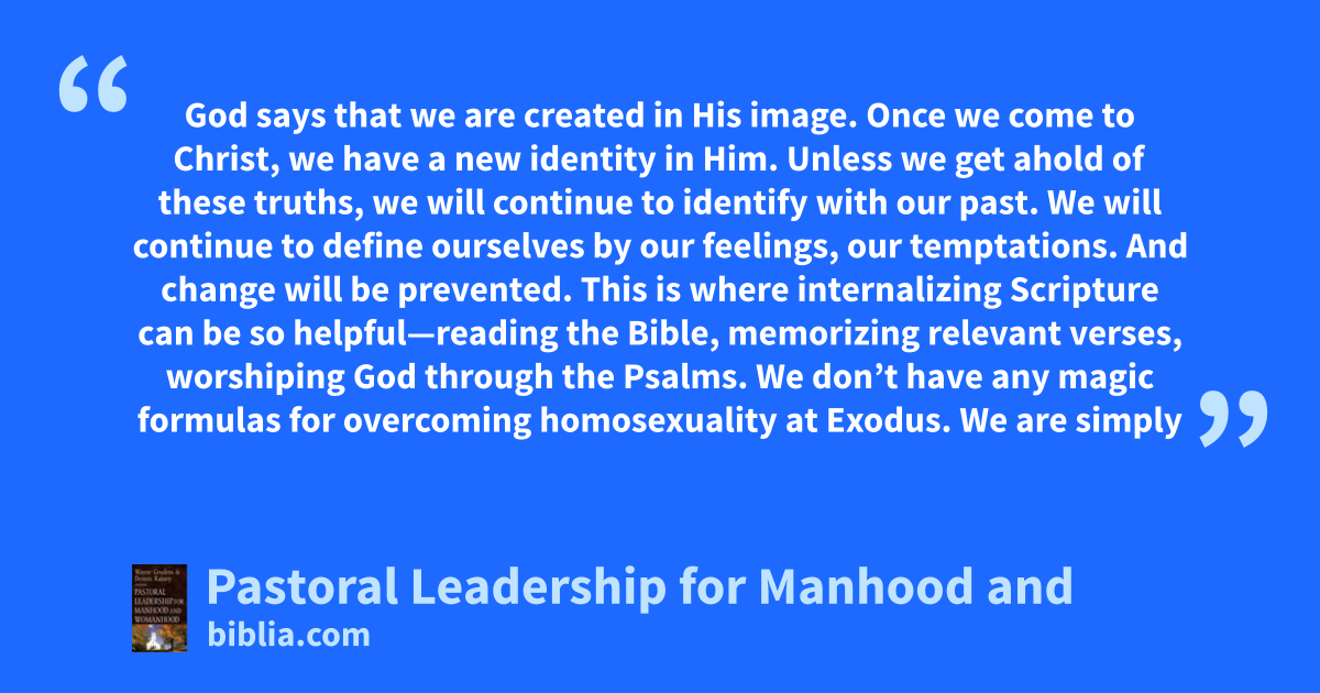 God says that we are created in His image. Once we come to Christ, we have a new identity in Him. Unless we get ahold of these truths, we will continue to identify with our past. We will continue to define ourselves by our feelings, our temptations. And change will be prevented. This is where internalizing Scripture can be so helpful—reading the Bible, memorizing relevant verses, worshiping God through the Psalms. We don’t have any magic formulas for overcoming homosexuality at Exodus. We are simply