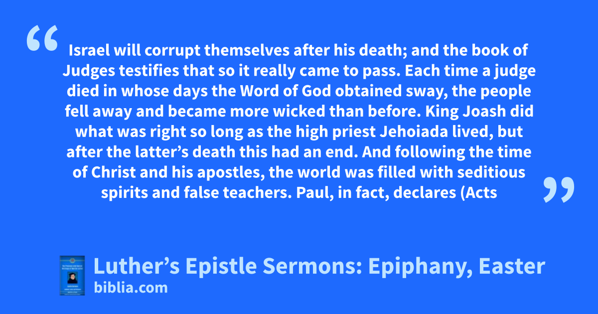 Israel will corrupt themselves after his death; and the book of Judges testifies that so it really came to pass. Each time a judge died in whose days the Word of God obtained sway, the people fell away and became more wicked than before. King Joash did what was right so long as the high priest Jehoiada lived, but after the latter’s death this had an end. And following the time of Christ and his apostles, the world was filled with seditious spirits and false teachers. Paul, in fact, declares (Acts