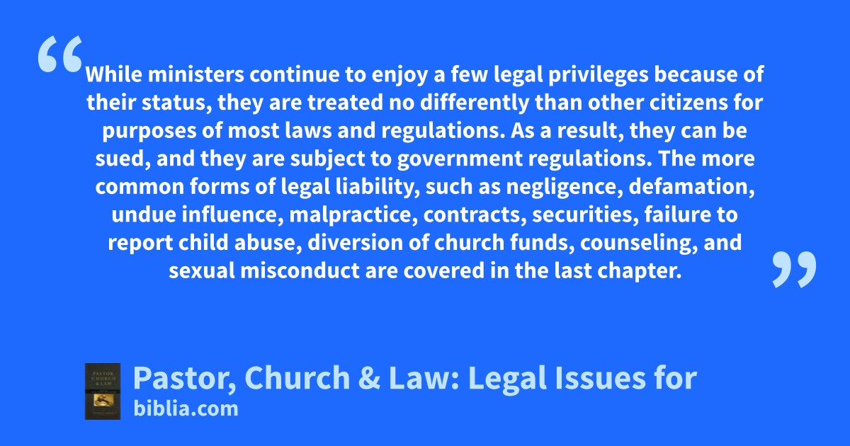 Understand the laws affecting pastors and why they are important for church boards and ministers to know. Richard Hammar uses court cases to help define and explain the legal distinction of ministerial status and its implications for pastors and church boards. This volume addresses clergy employment contracts, compensation, termination, legal privileges and conditions of ministers, and the legal...
