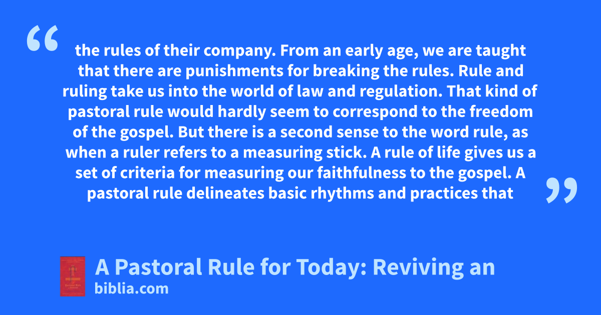 the rules of their company. From an early age, we are taught that there are punishments for breaking the rules. Rule and ruling take us into the world of law and regulation. That kind of pastoral rule would hardly seem to correspond to the freedom of the gospel. But there is a second sense to the word rule, as when a ruler refers to a measuring stick. A rule of life gives us a set of criteria for measuring our faithfulness to the gospel. A pastoral rule delineates basic rhythms and practices that