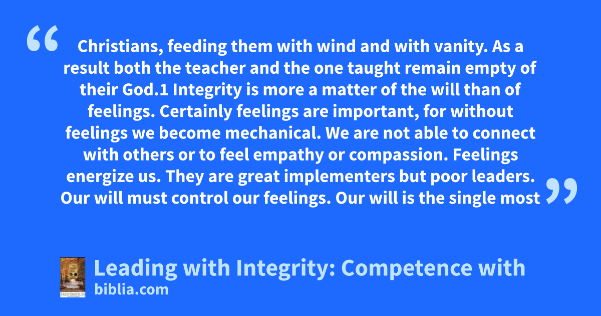 Christians, feeding them with wind and with vanity. As a result both the teacher and the one taught remain empty of their God.1 Integrity is more a matter of the will than of feelings. Certainly feelings are important, for without feelings we become mechanical. We are not able to connect with others or to feel empathy or compassion. Feelings energize us. They are great implementers but poor leaders. Our will must control our feelings. Our will is the single most