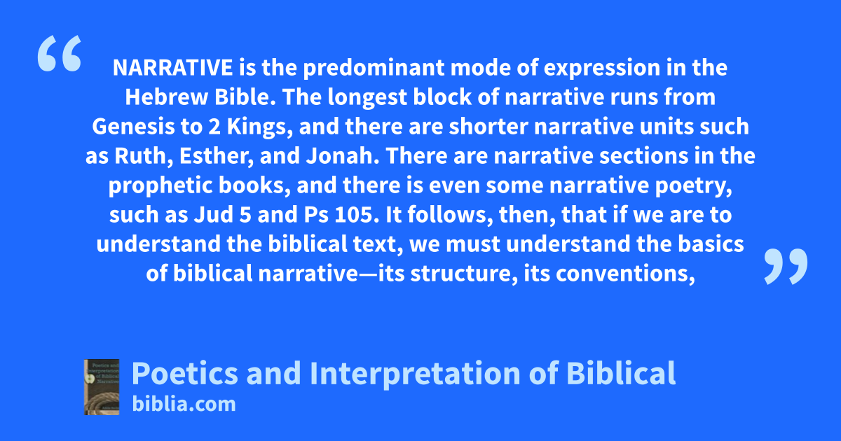 NARRATIVE is the predominant mode of expression in the Hebrew Bible. The longest block of narrative runs from Genesis to 2 Kings, and there are shorter narrative units such as Ruth, Esther, and Jonah. There are narrative sections in the prophetic books, and there is even some narrative poetry, such as Jud 5 and Ps 105. It follows, then, that if we are to understand the biblical text, we must understand the basics of biblical narrative—its structure, its conventions,