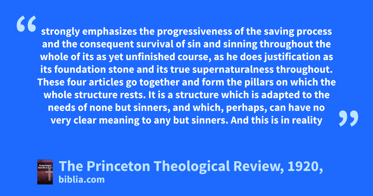 strongly emphasizes the progressiveness of the saving process and the consequent survival of sin and sinning throughout the whole of its as yet unfinished course, as he does justification as its foundation stone and its true supernaturalness throughout. These four articles go together and form the pillars on which the whole structure rests. It is a structure which is adapted to the needs of none but sinners, and which, perhaps, can have no very clear meaning to any but sinners. And this is in reality