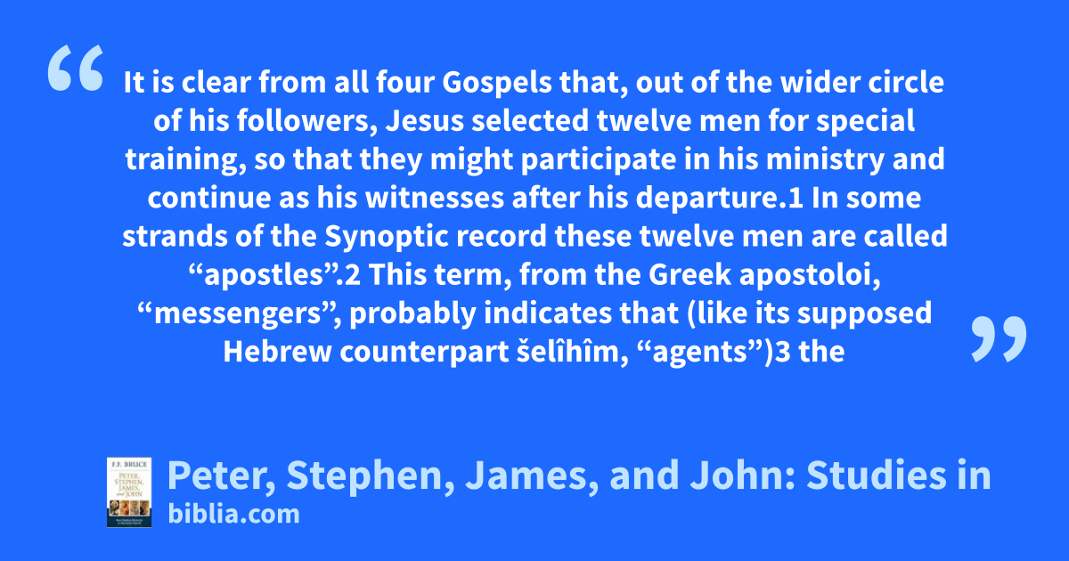 It is clear from all four Gospels that, out of the wider circle of his followers, Jesus selected twelve men for special training, so that they might participate in his ministry and continue as his witnesses after his departure.1 In some strands of the Synoptic record these twelve men are called “apostles”.2 This term, from the Greek apostoloi, “messengers”, probably indicates that (like its supposed Hebrew counterpart šelîhîm, “agents”)3 the