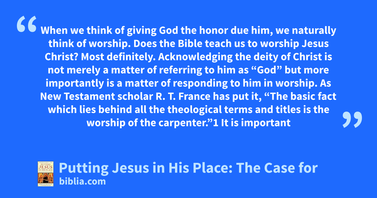 When we think of giving God the honor due him, we naturally think of worship. Does the Bible teach us to worship Jesus Christ? Most definitely. Acknowledging the deity of Christ is not merely a matter of referring to him as “God” but more importantly is a matter of responding to him in worship. As New Testament scholar R. T. France has put it, “The basic fact which lies behind all the theological terms and titles is the worship of the carpenter.”1 It is important