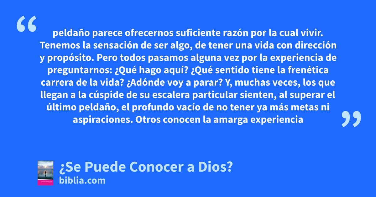 peldaño parece ofrecernos suficiente razón por la cual vivir. Tenemos la sensación de ser algo, de tener una vida con dirección y propósito. Pero todos pasamos alguna vez por la experiencia de preguntarnos: ¿Qué hago aquí? ¿Qué sentido tiene la frenética carrera de la vida? ¿Adónde voy a parar? Y, muchas veces, los que llegan a la cúspide de su escalera particular sienten, al superar el último peldaño, el profundo vacío de no tener ya más metas ni aspiraciones. Otros conocen la amarga experiencia