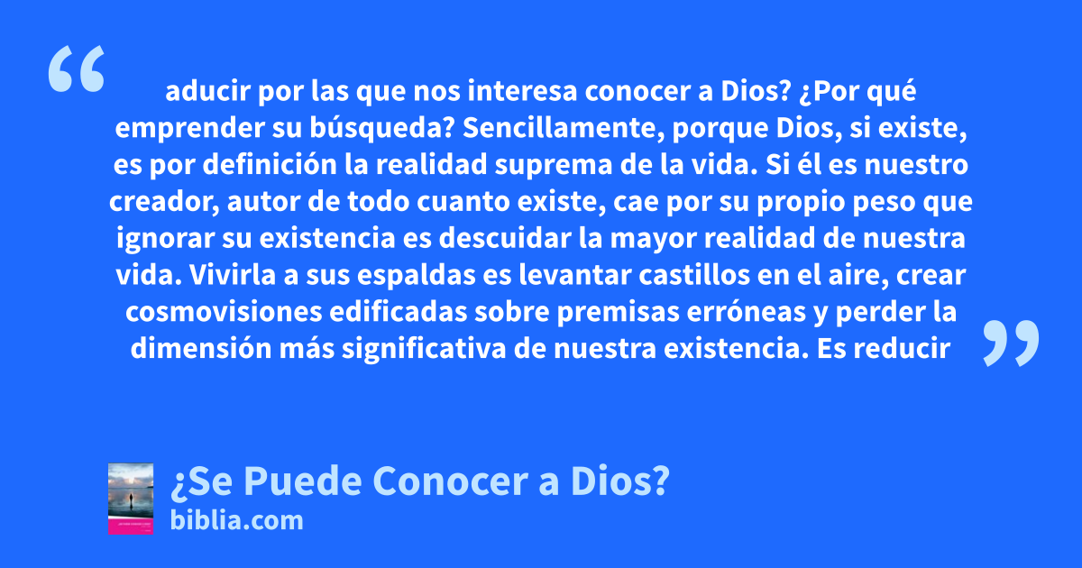 aducir por las que nos interesa conocer a Dios? ¿Por qué emprender su búsqueda? Sencillamente, porque Dios, si existe, es por definición la realidad suprema de la vida. Si él es nuestro creador, autor de todo cuanto existe, cae por su propio peso que ignorar su existencia es descuidar la mayor realidad de nuestra vida. Vivirla a sus espaldas es levantar castillos en el aire, crear cosmovisiones edificadas sobre premisas erróneas y perder la dimensión más significativa de nuestra existencia. Es reducir